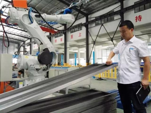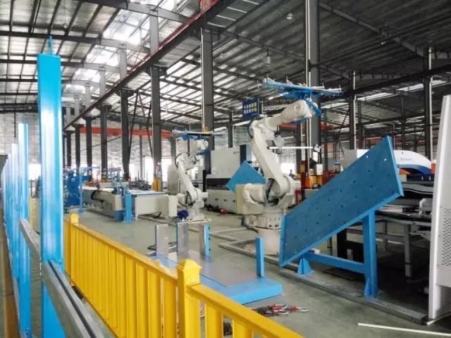 客户定单纷至沓来,“机器换人”势在必行。今年3月,该公司正式实施技改方案,对车间场地重新排布,引进“机器人”,形成现代化电梯门板柔性生产线。在车间的北侧,一条全新的生产线东西向排布,大约60米长,被栅栏隔开,三个大机械臂矗立其中,与其它设备形成鲜明对比。