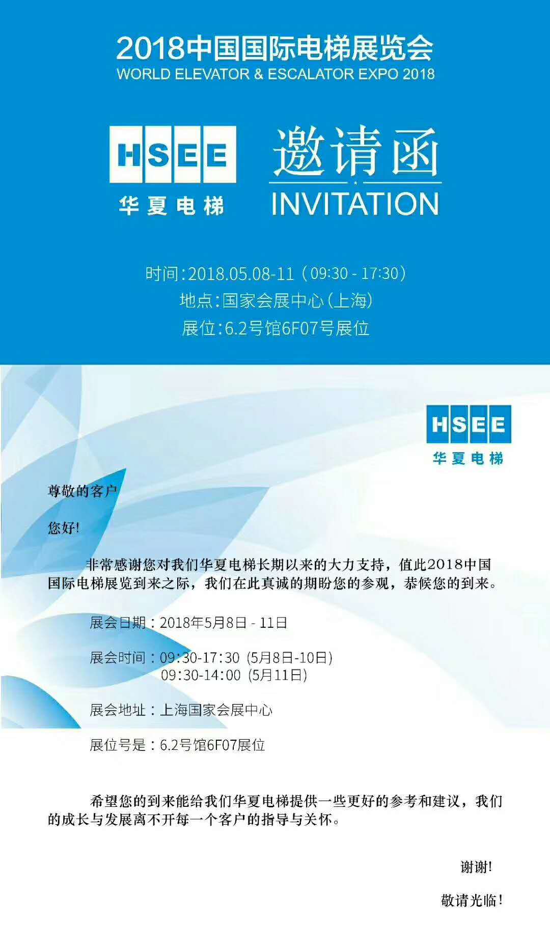 非常感谢您对我们华夏电梯长期以来的大力支持,值此2018中国国际电梯展览到来之际,我们在此真诚的期盼您的参观,恭候您的到来。